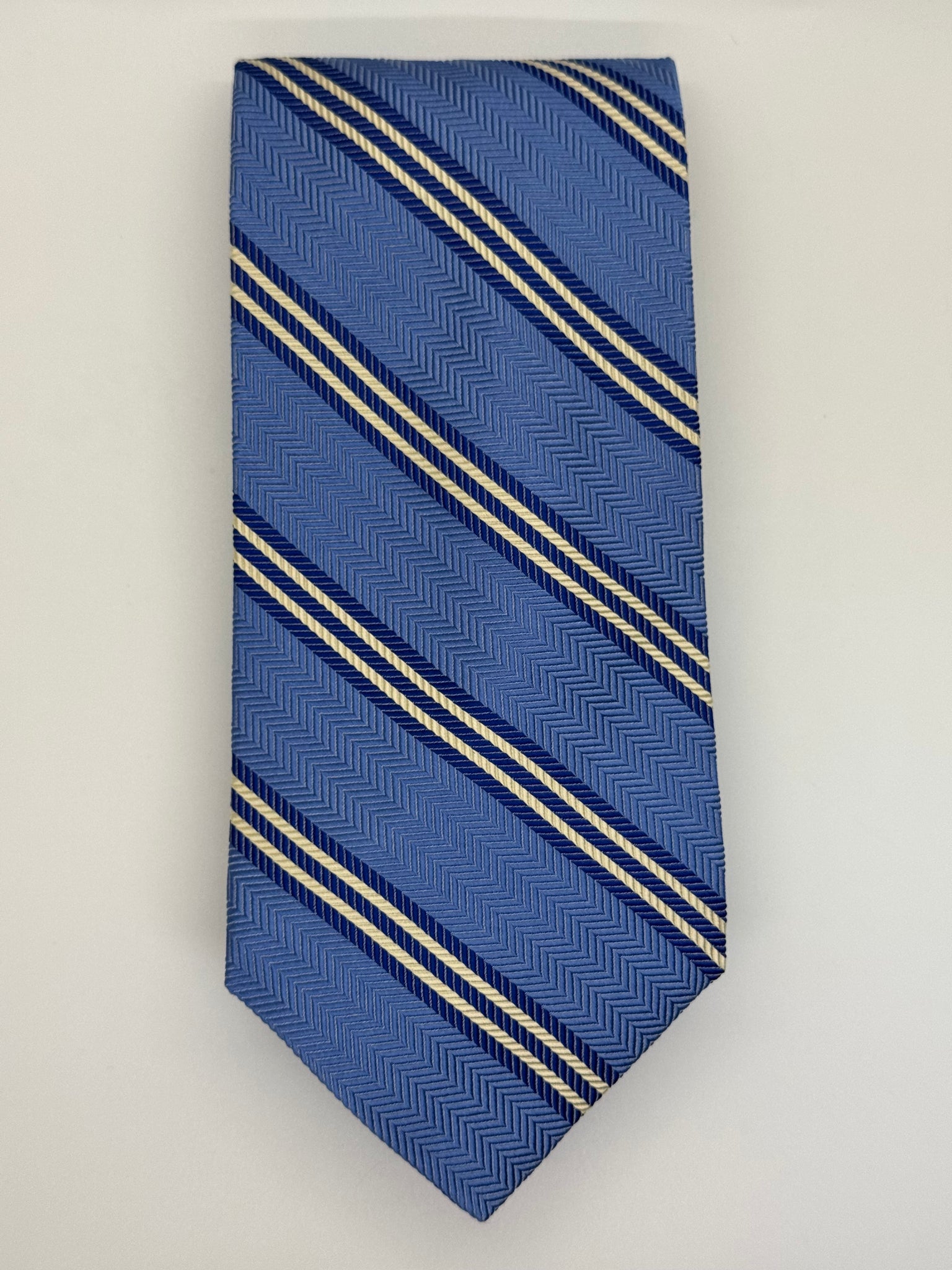 Understated luxury, this Faconnable silk tie features a refined light blue herringbone ground with diagonal navy and cream stripes. A perfect blend of French sophistication and everyday versatility.