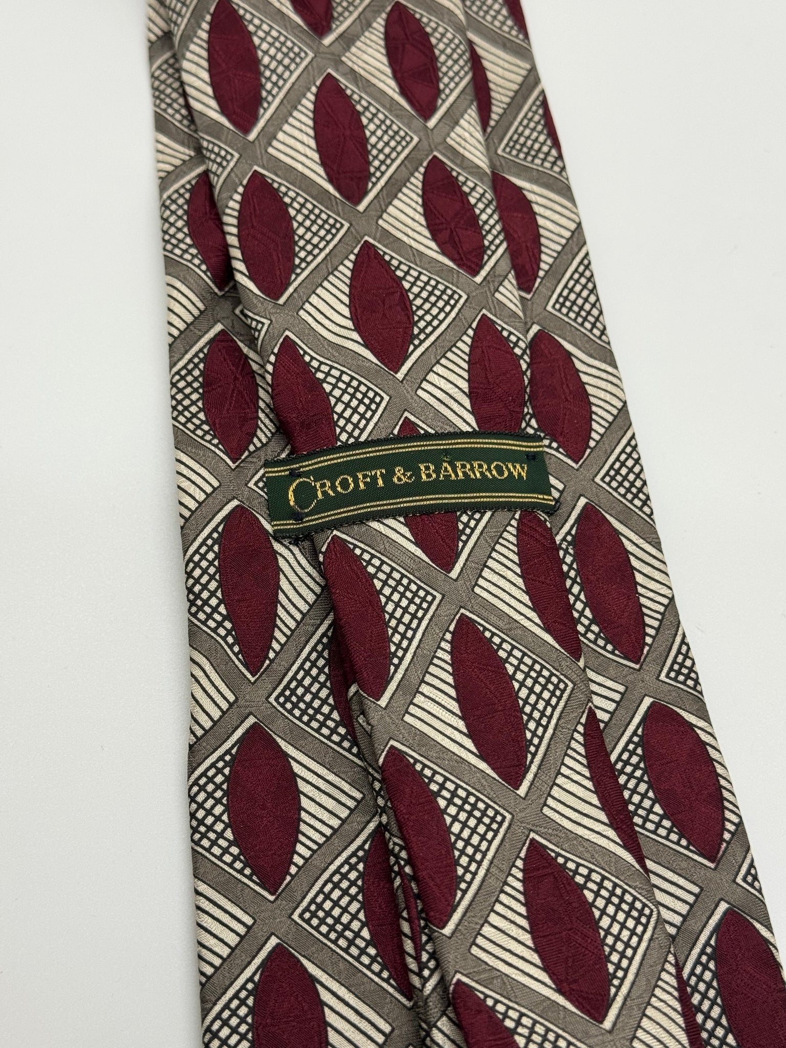Elevate your rotation with this vintage-inspired Croft & Barrow geometric tie, featuring a bold burgundy diamond motif set against a taupe and cream lattice background. The pattern is striking without being loud — perfect for adding personality to a crisp white, cream, or light grey dress shirt.