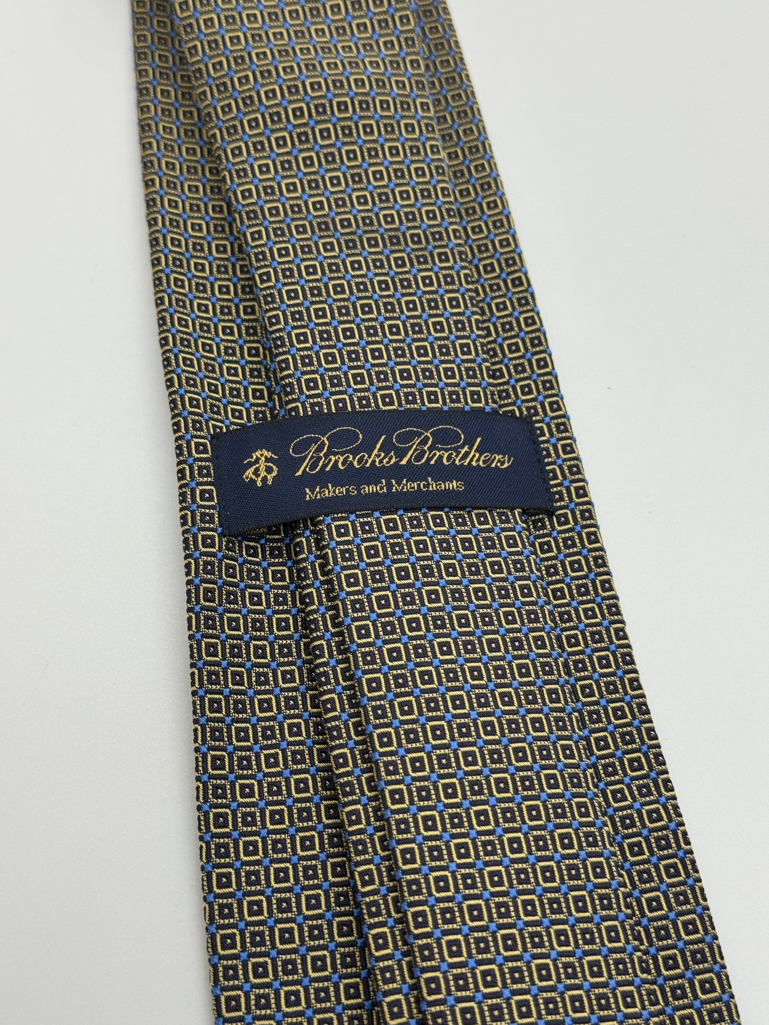 A refined piece from Brooks Brothers’ Makers & Merchants line, this tie features a detailed navy and gold geometric square pattern. Crafted from silk, it delivers a polished texture and a rich depth of color that elevates any ensemble. The design strikes the perfect balance between boldness and subtlety, making it versatile for both business and formal wear.