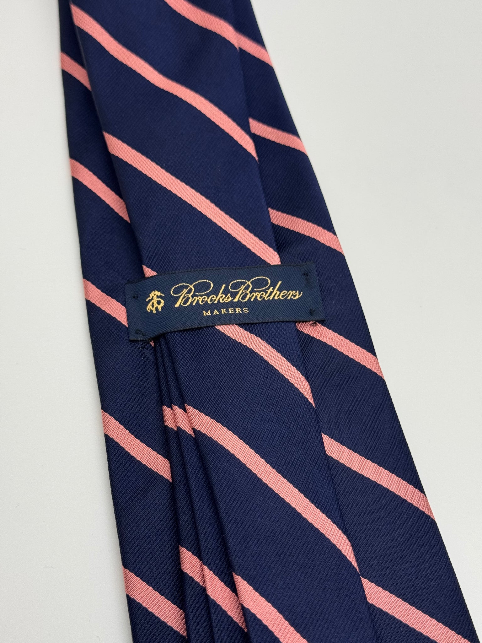 A perfect blend of tradition and modern flair, this Brooks Brothers tie features a bold diagonal stripe design in soft pink against a deep navy backdrop. Made from pure silk, it delivers the smooth texture and refined drape that Brooks Brothers is known for. The color combination gives a classic pattern a fresh, stylish update — equally sharp for boardroom meetings or wedding celebrations.