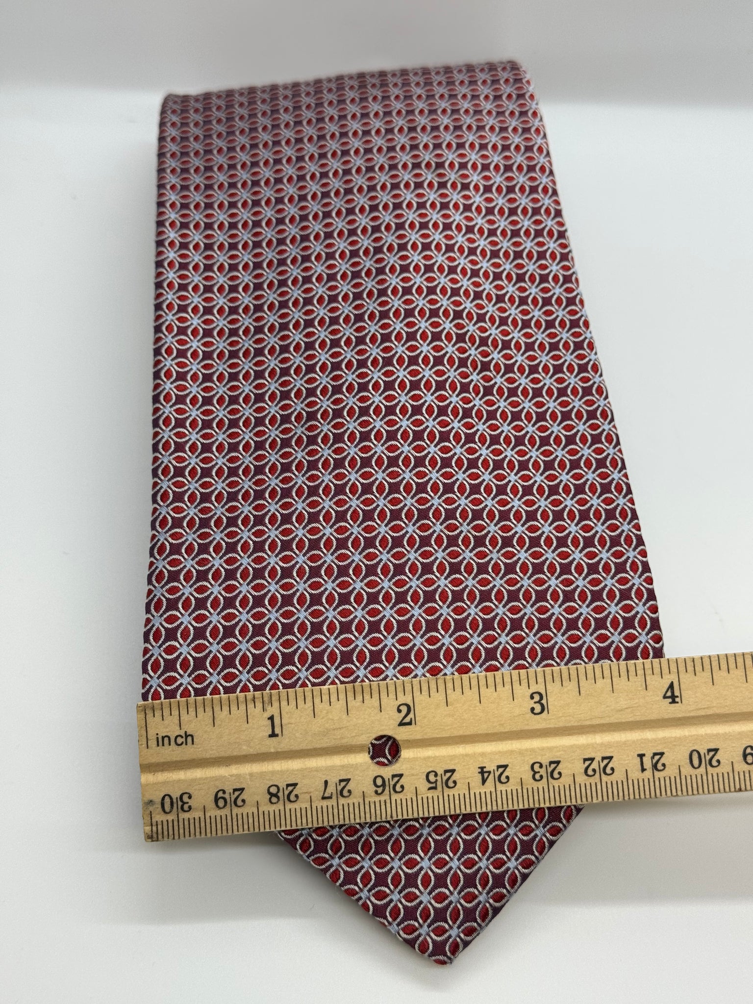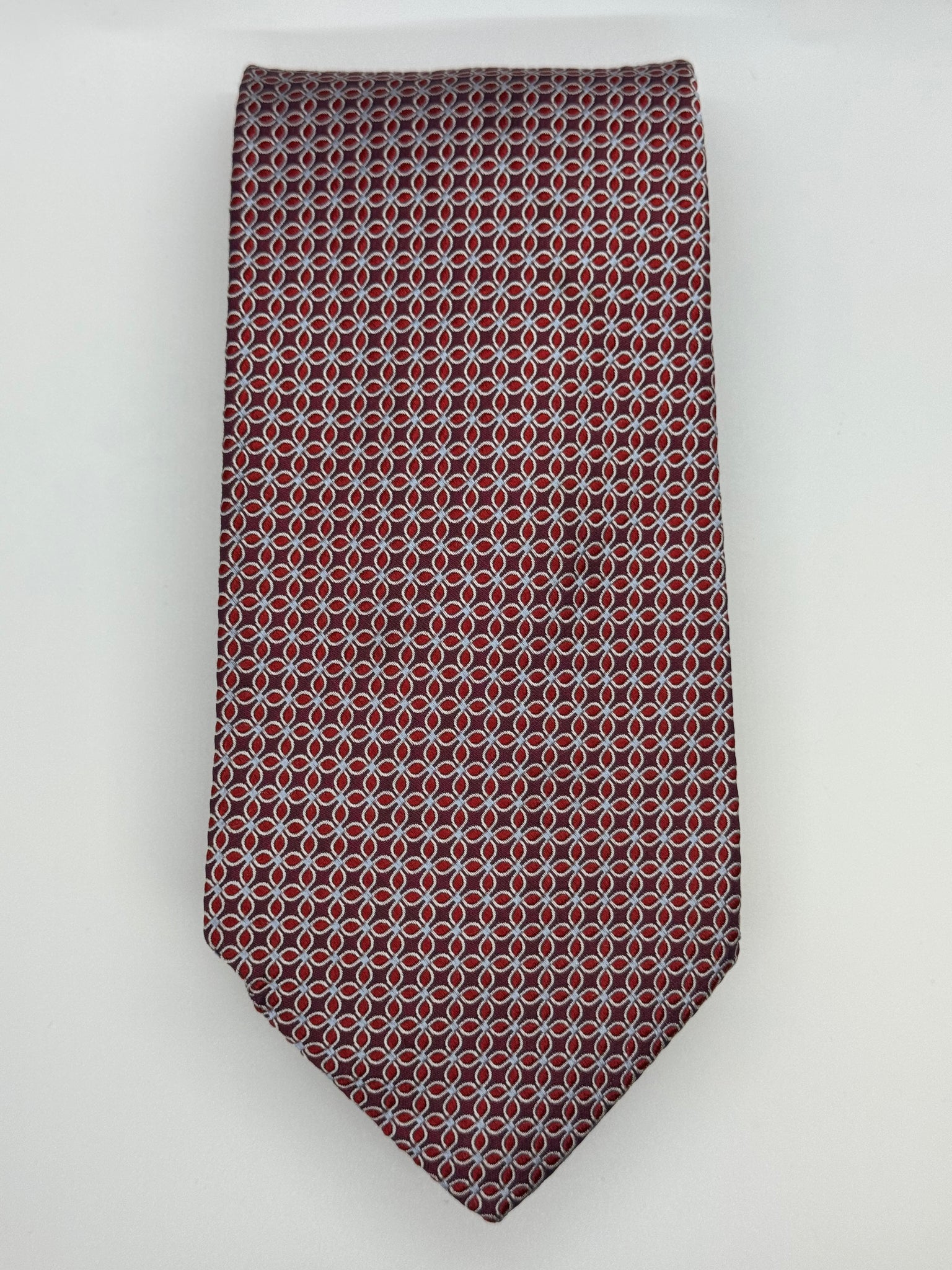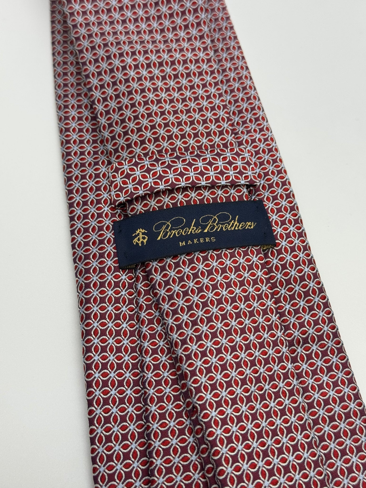 A classic Brooks Brothers design, this tie features an intricate geometric interlocking pattern in soft blue and white, set against a rich red backdrop. The timeless motif gives it just the right balance of tradition and refinement, making it versatile enough for boardroom meetings, weddings, or evening events.